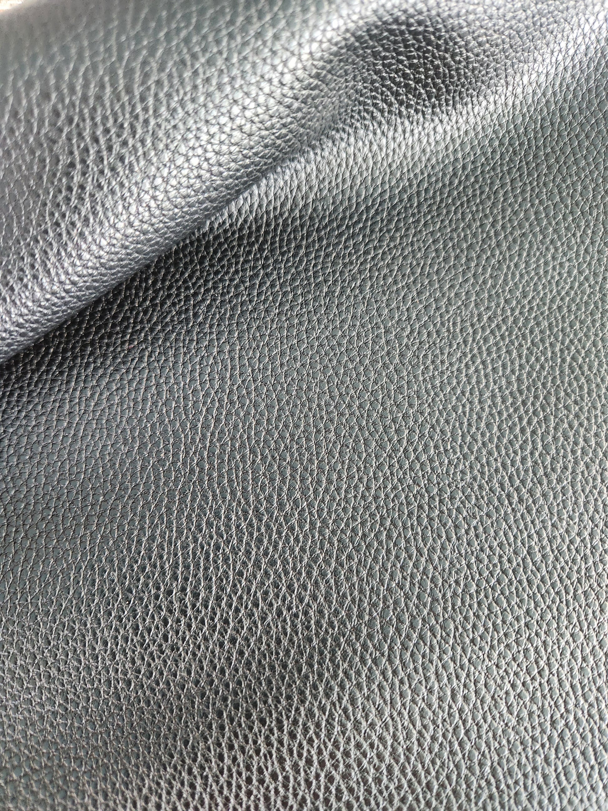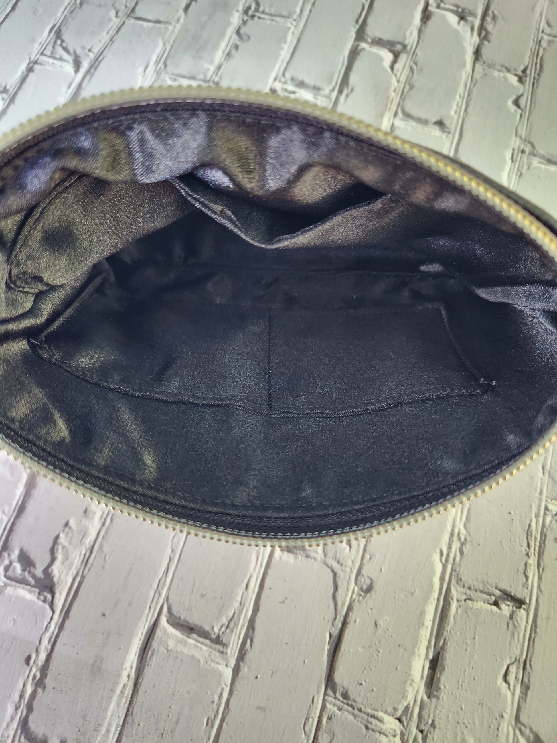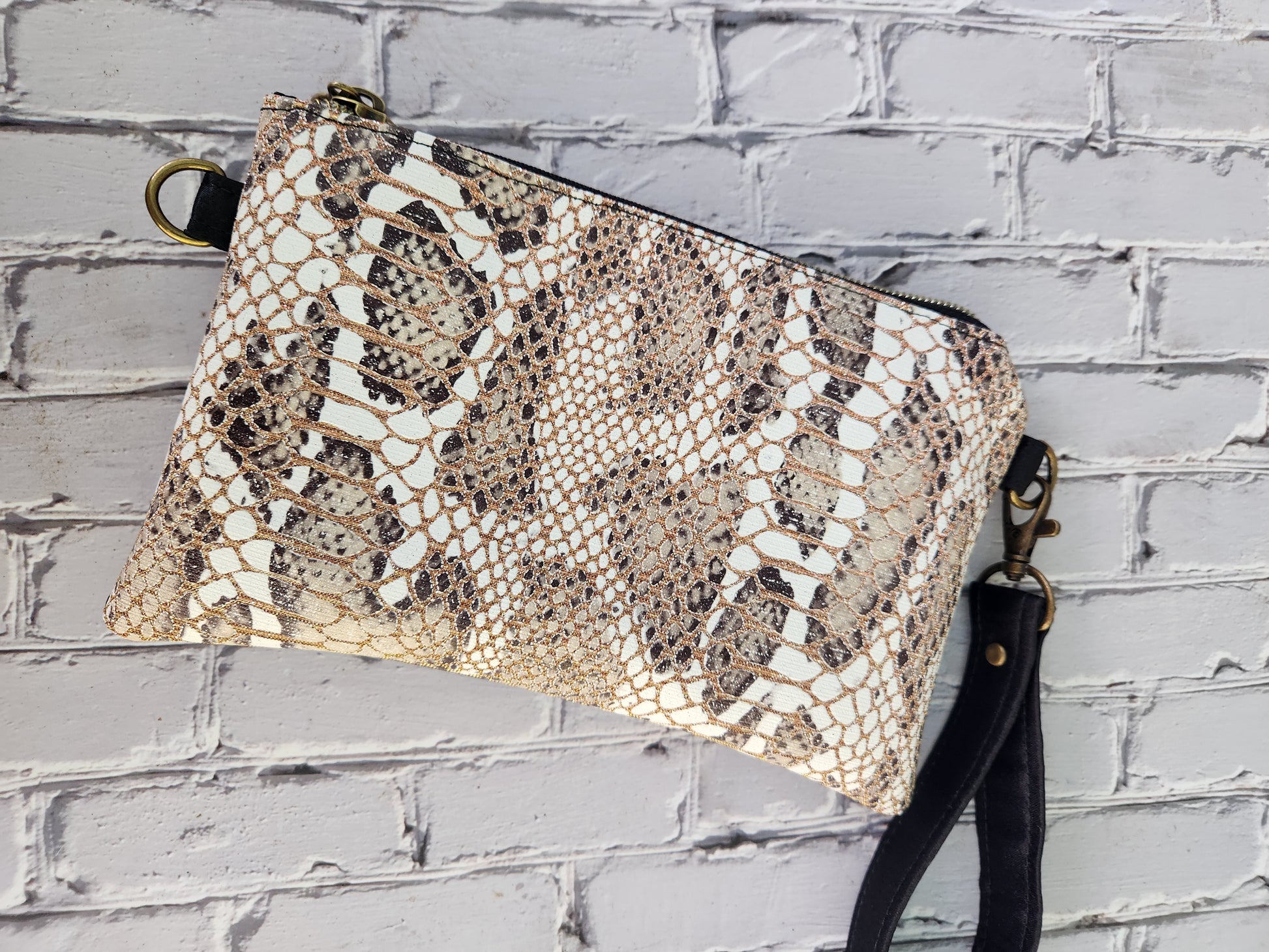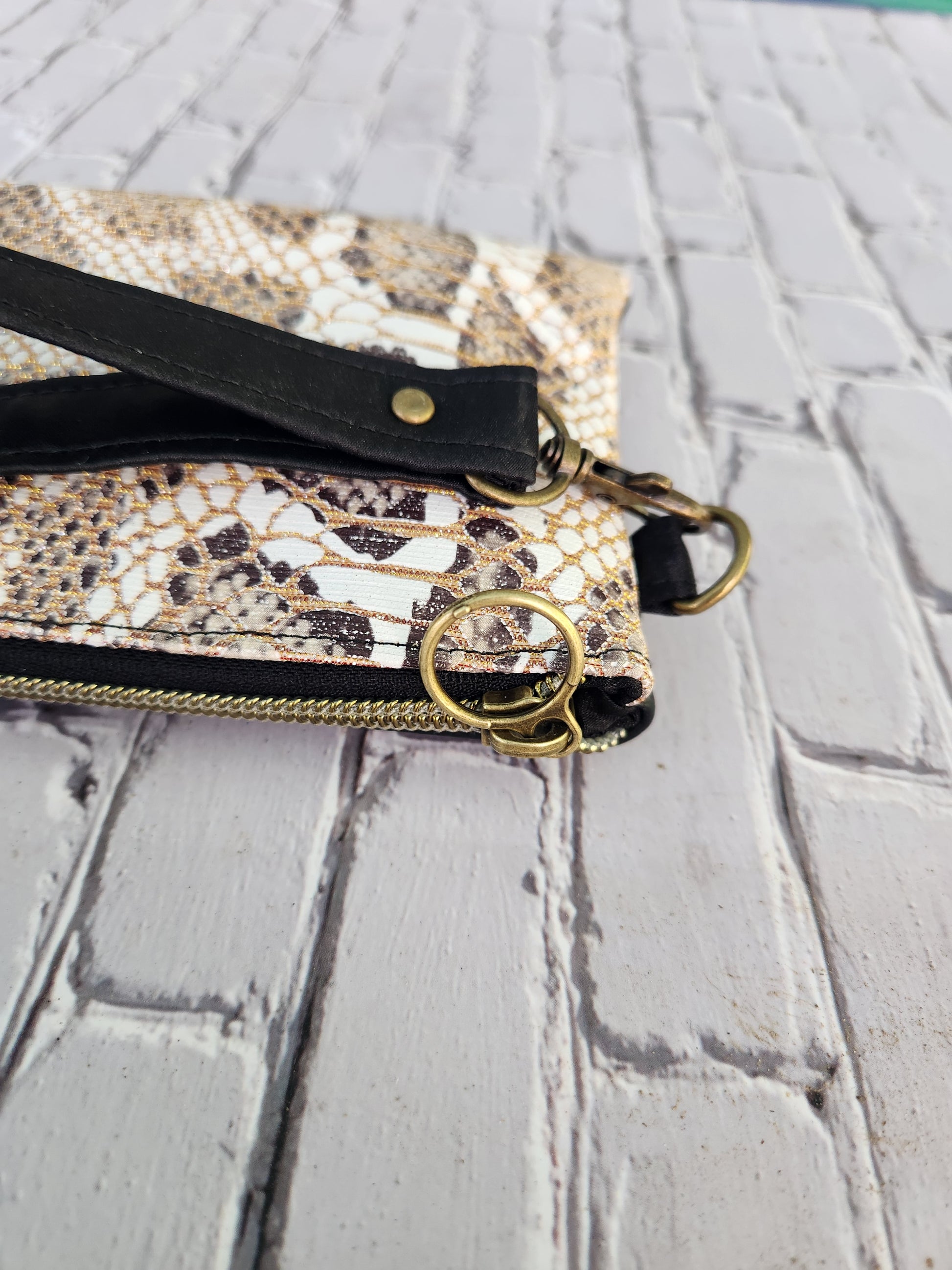 Glittery textured snakeskin on the front, black pebbled vegan leather on the back. Zipper top with cash and card pockets on the interior. Satin wristlet strap included.