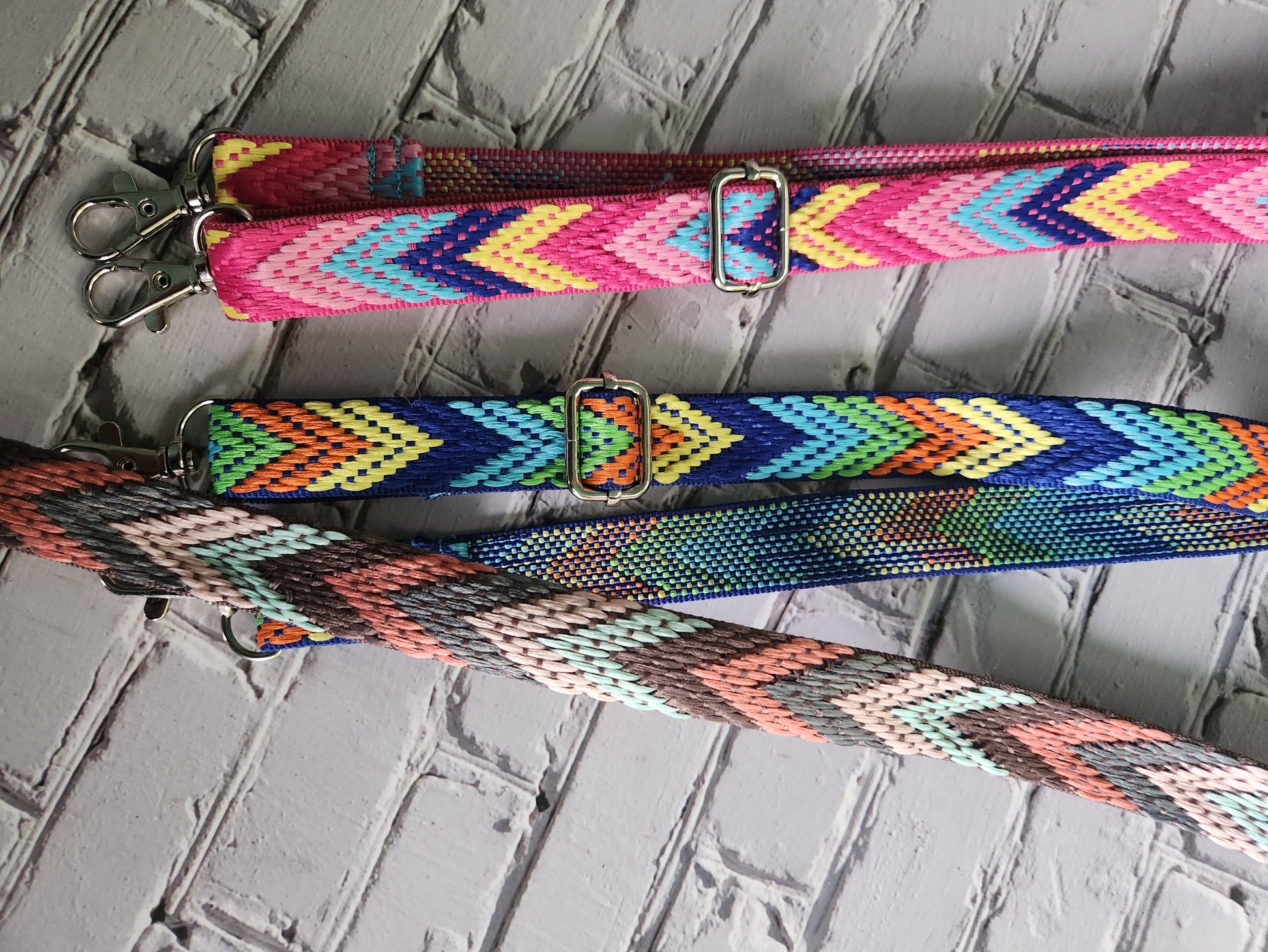 Add a pop of color to your bag or give a well loved bag a fresh face with this embroidered adjustable crossbody strap. Adjustable from approx 23- 45" and 3/4" wide.