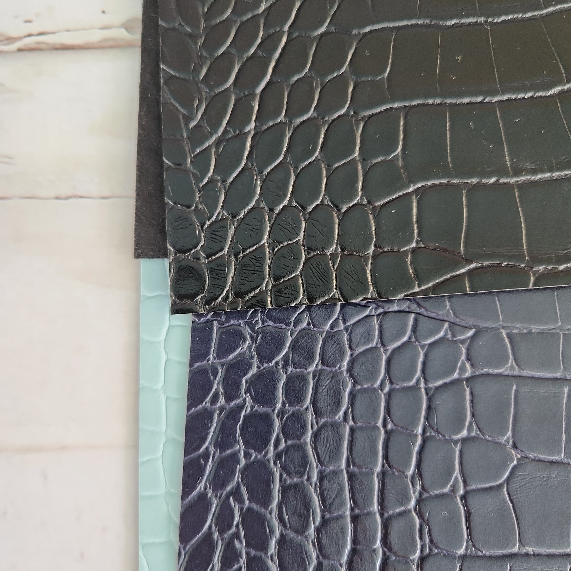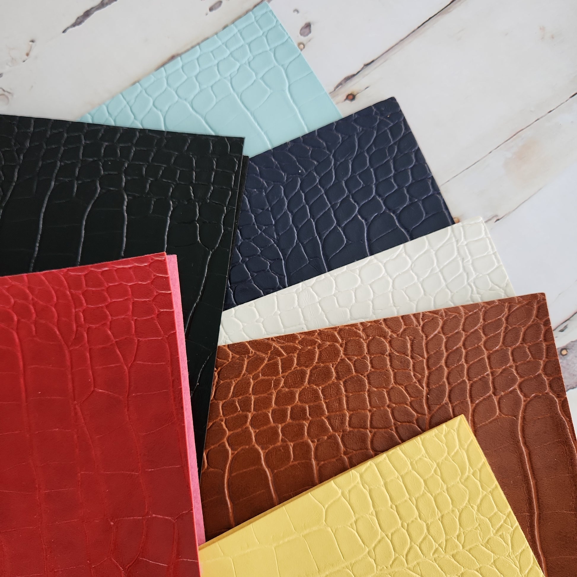 This beautiful vegan leather has alligator textured embossing, a patent leather finish and comes in a wide variety of colors!