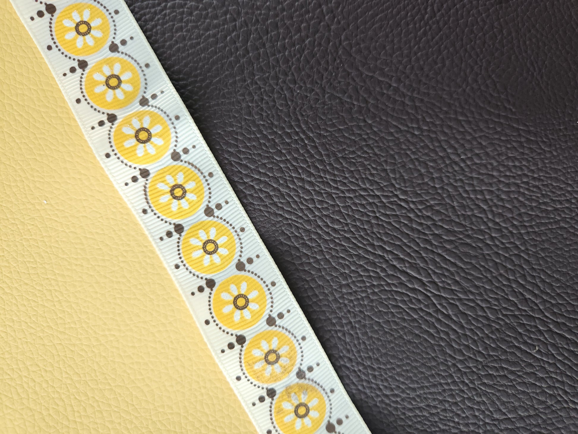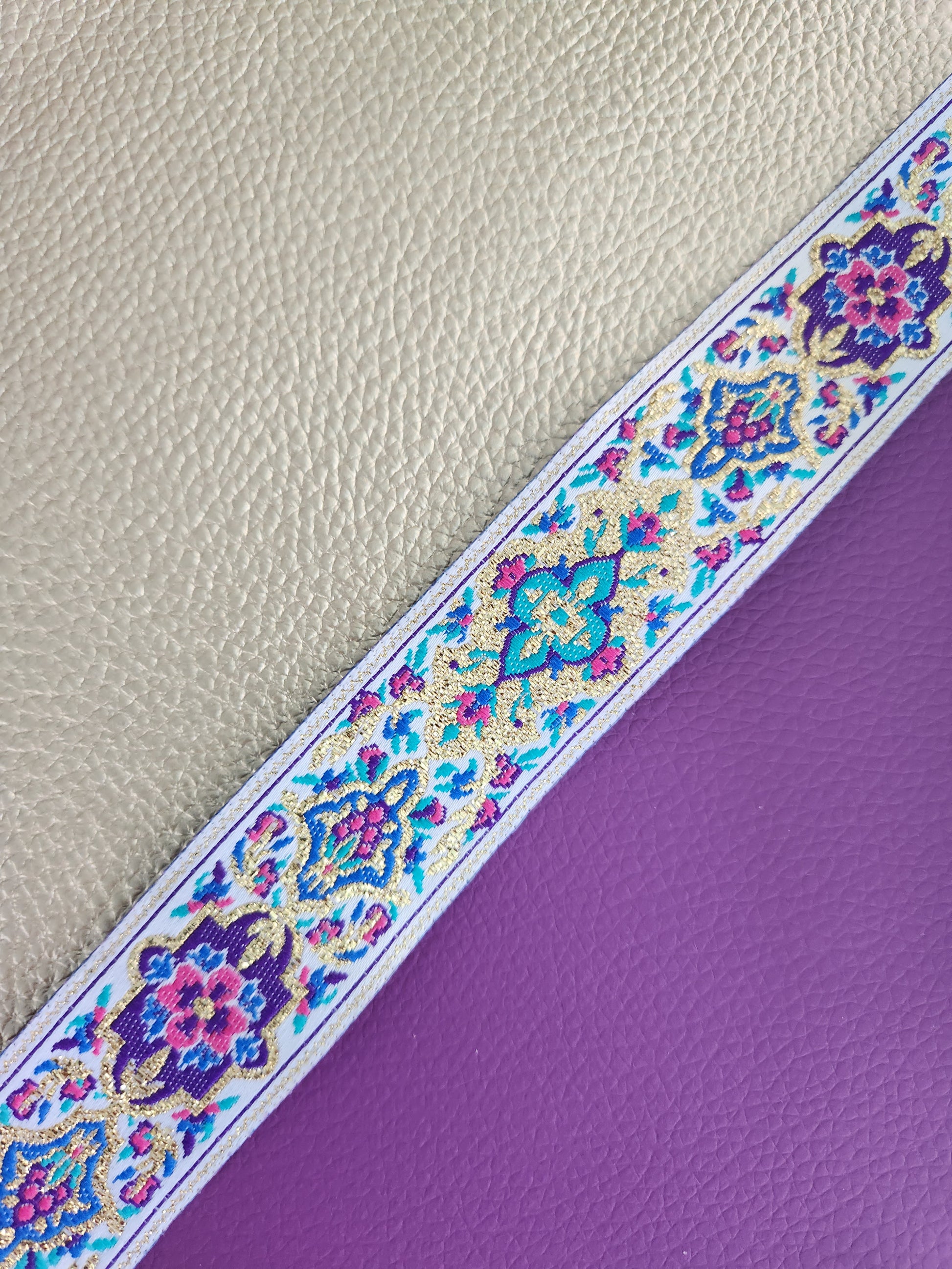 Decorative piecing and ribbon on the front, zippered main compartment, exterior slide pocket and cash and card pockets on the interior.