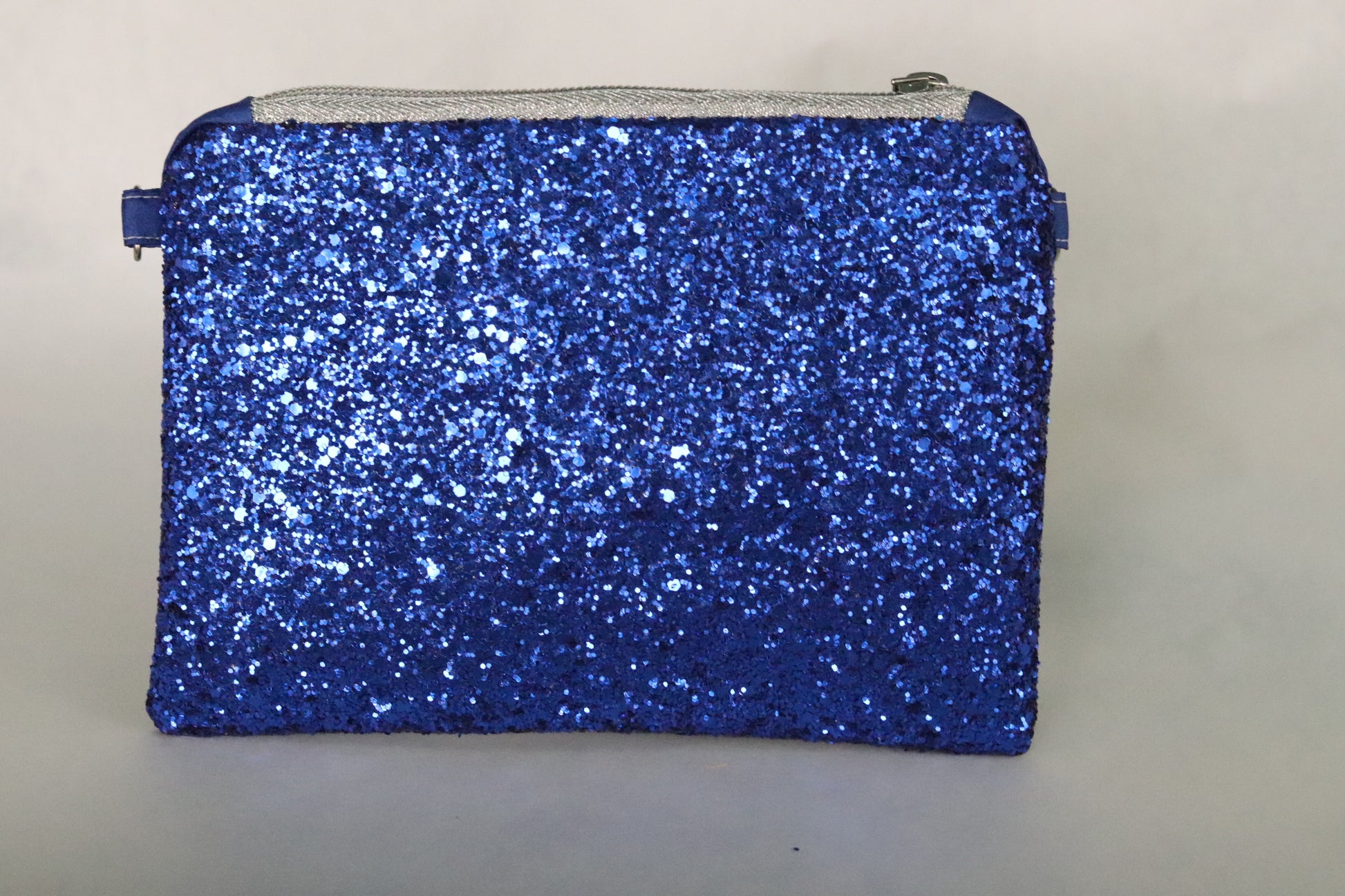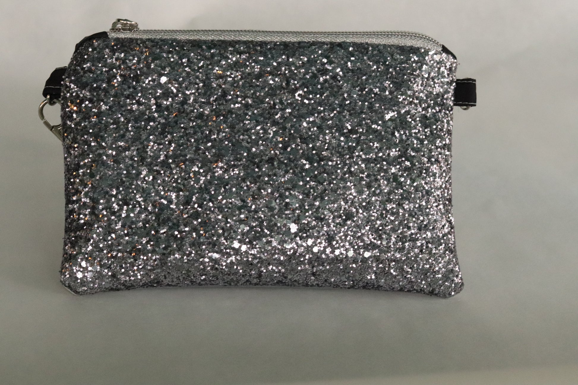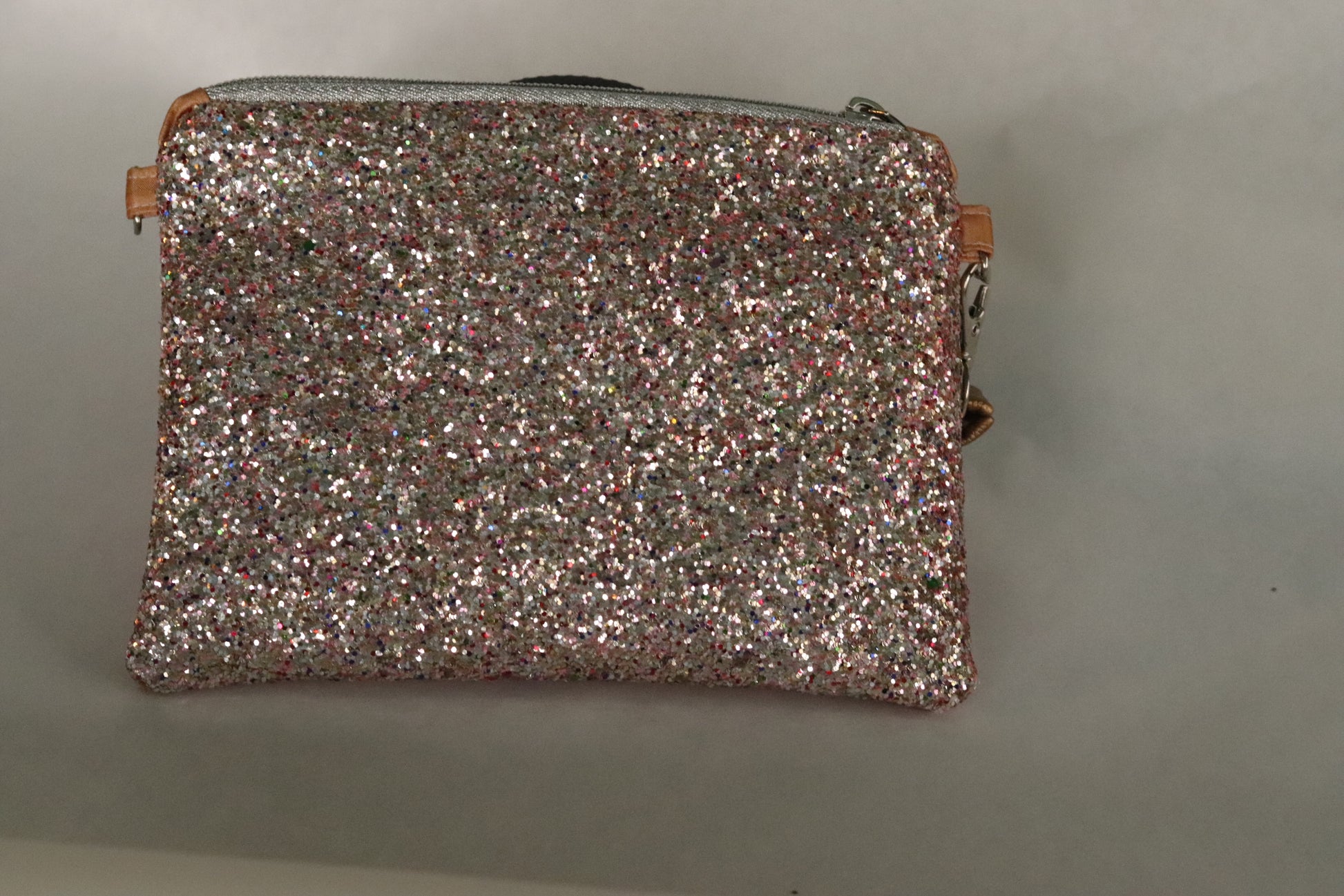 The perfect size to toss in your phone, lip gloss, keys, cash, sunglasses. Shimmering glitter fabric, in an array of colors, is sure to catch an eye and complete any outfit. Opposite side is soft vegan leather. Satin interior.
