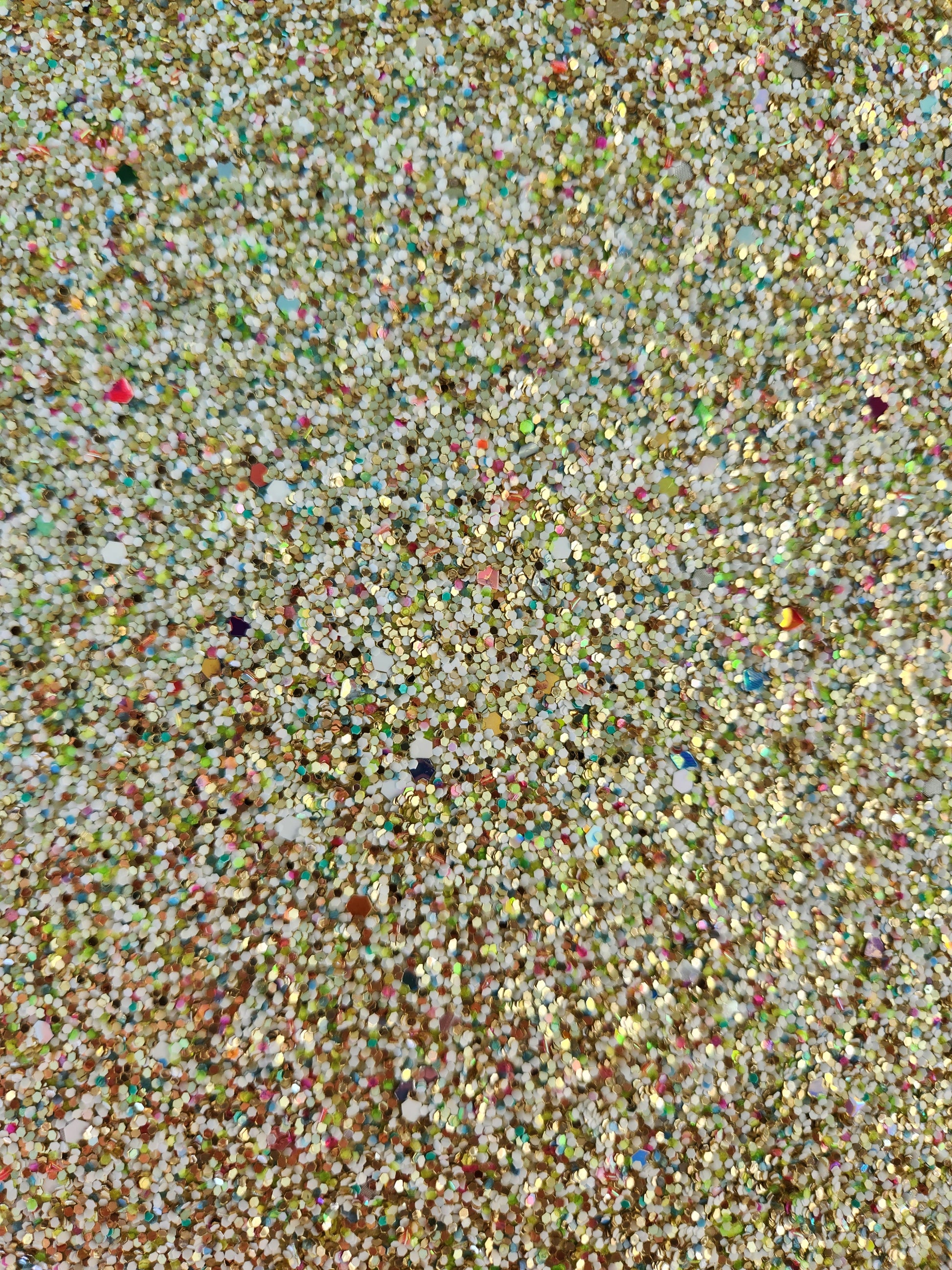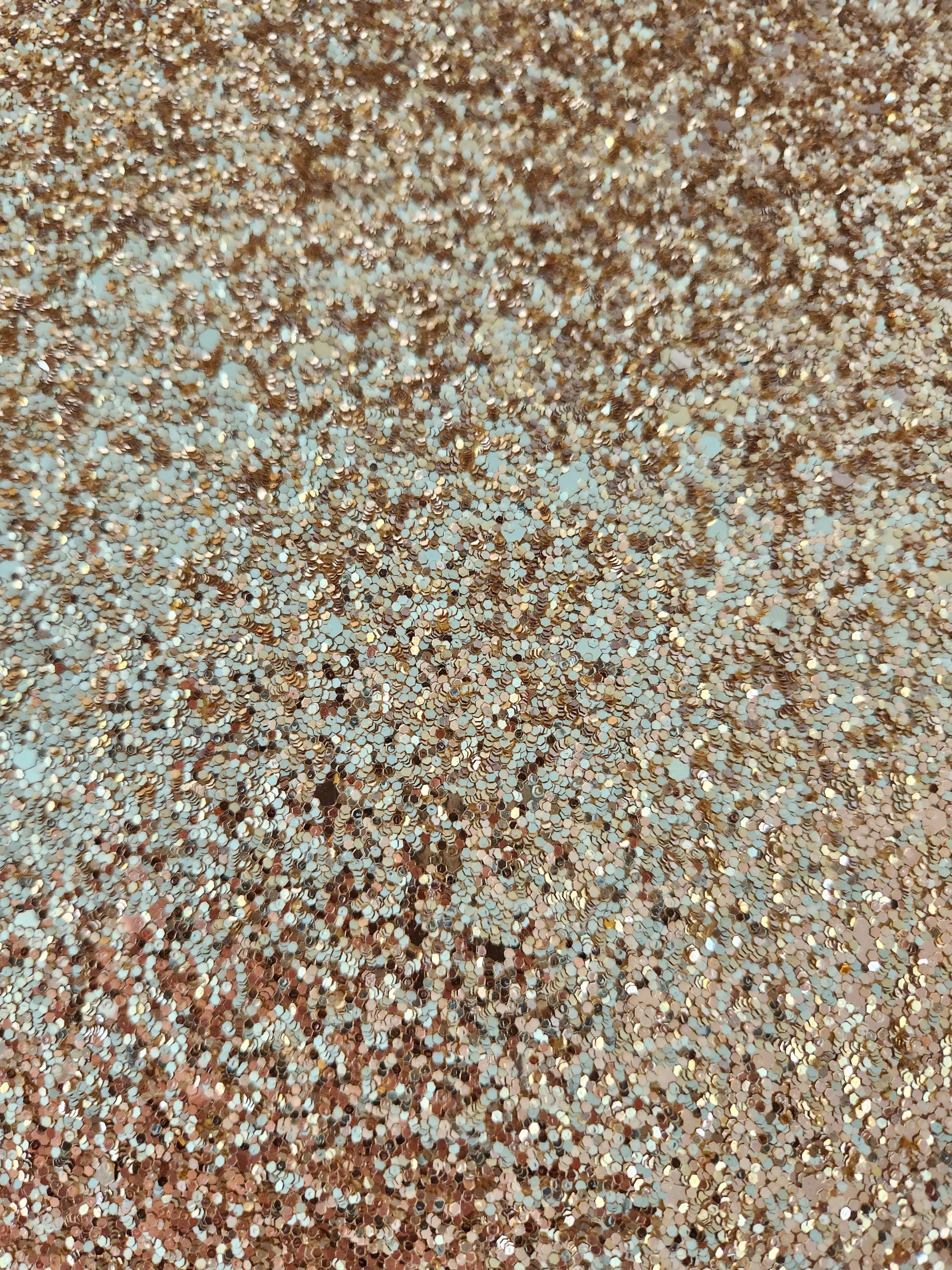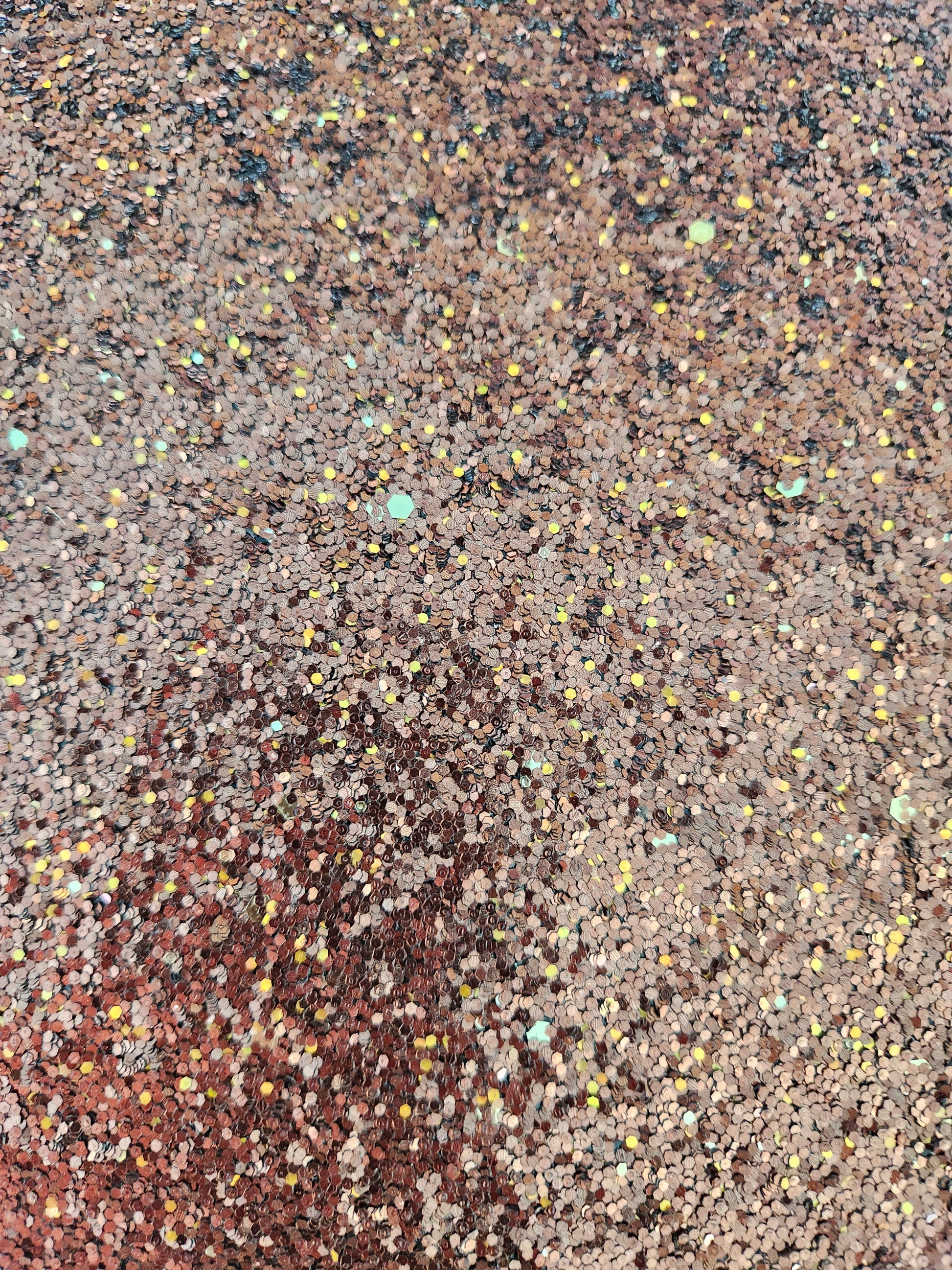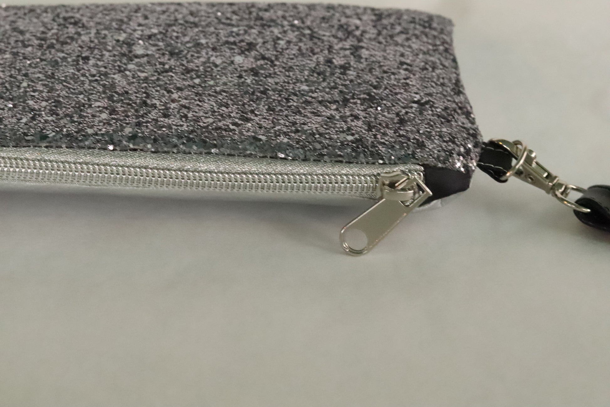 The perfect size to toss in your phone, lip gloss, keys, cash, sunglasses. Shimmering glitter fabric, in an array of colors, is sure to catch an eye and complete any outfit. Opposite side is soft vegan leather. Satin interior.