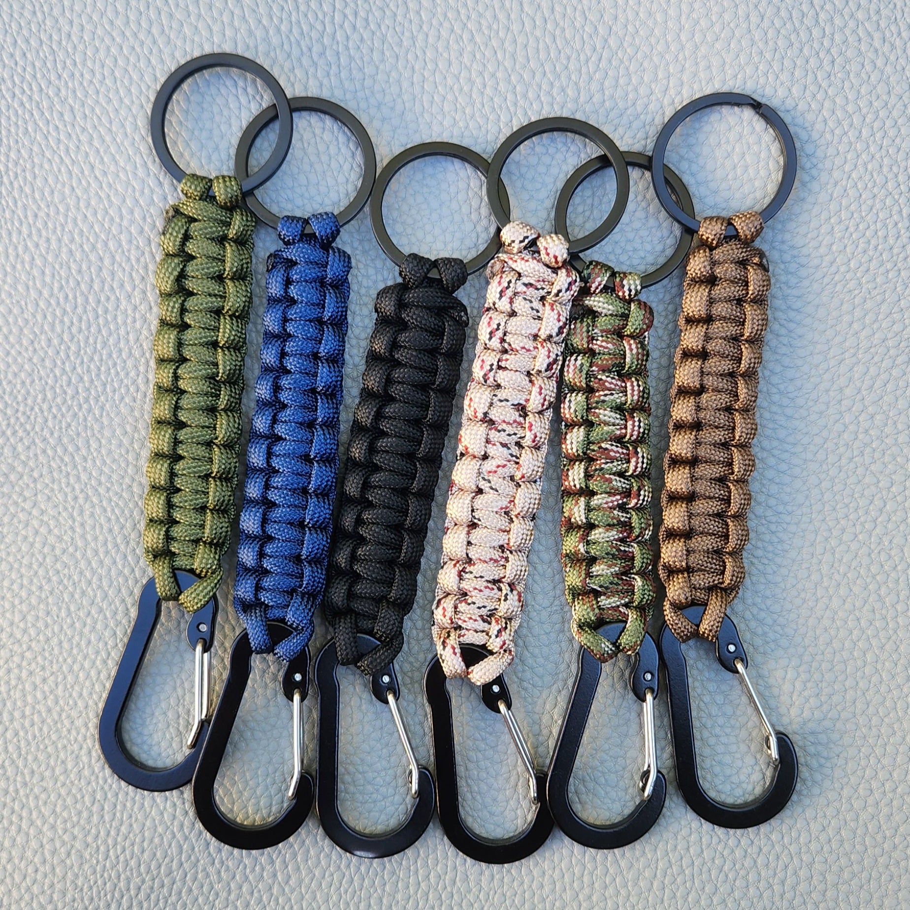 Durable macrame paracord with 2" carabiner and keyring. Modern matte black hardware. 6" overall length