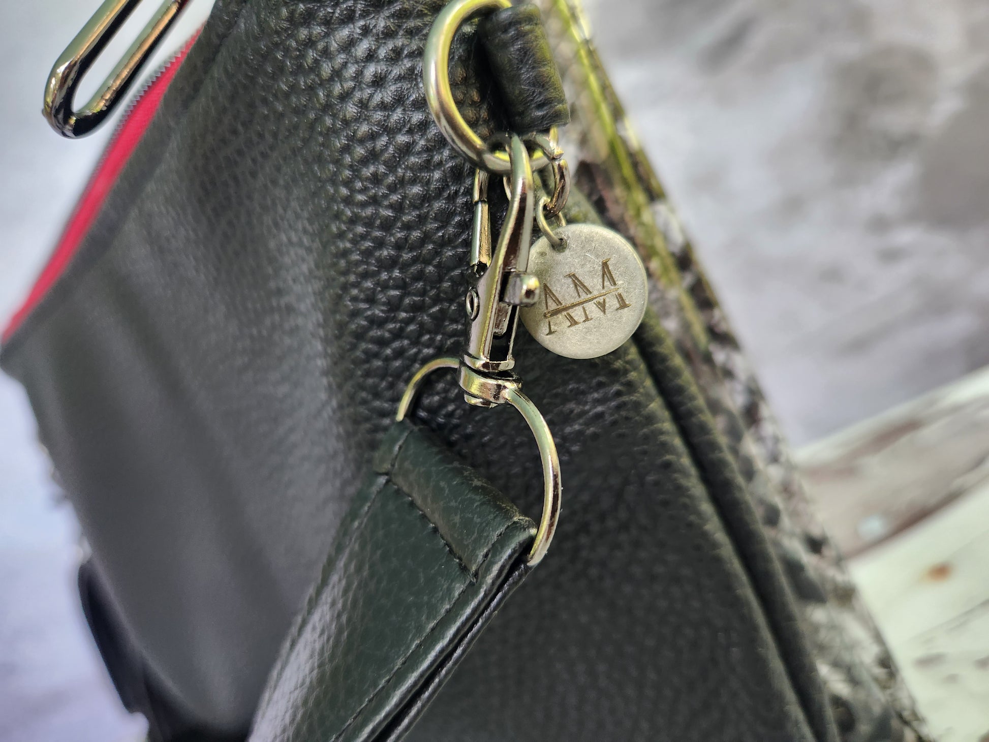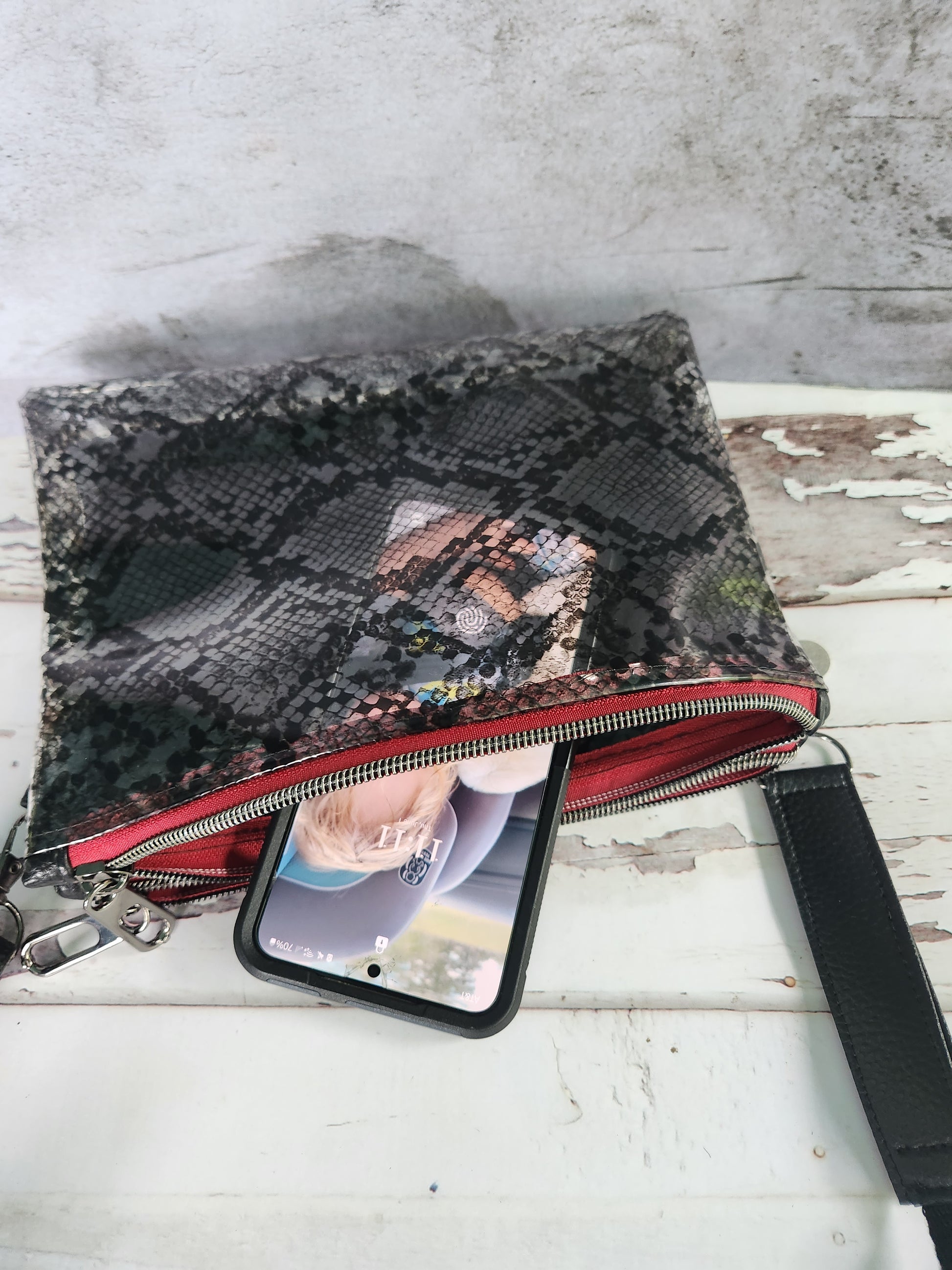 It's been crafted from two 9x6 zippered compartments - 1 black leather, and 1 see through snakeskin print vinyl. Gunmetal hardware with red accents. There is a hidden bonus pocket on the top between the two to keep your phone or sunglasses handy. Also an additional slide pocket inside of the vinyl pocket.